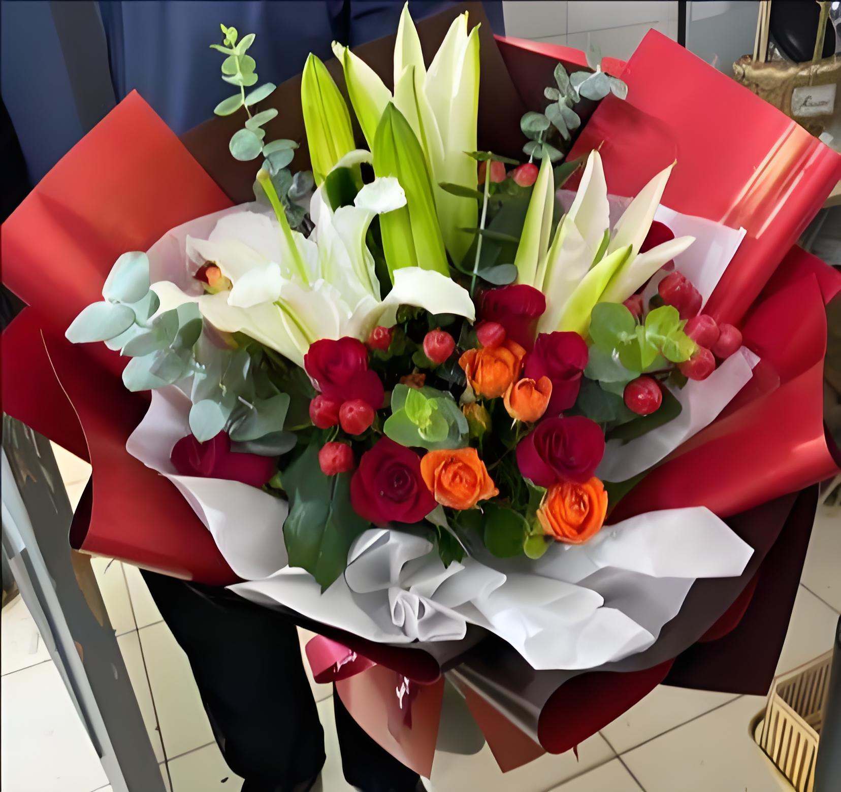 安阳花店包11枝红玫瑰、2枝多头白百合、6枝橙色多头玫瑰、红豆、尤加利叶
